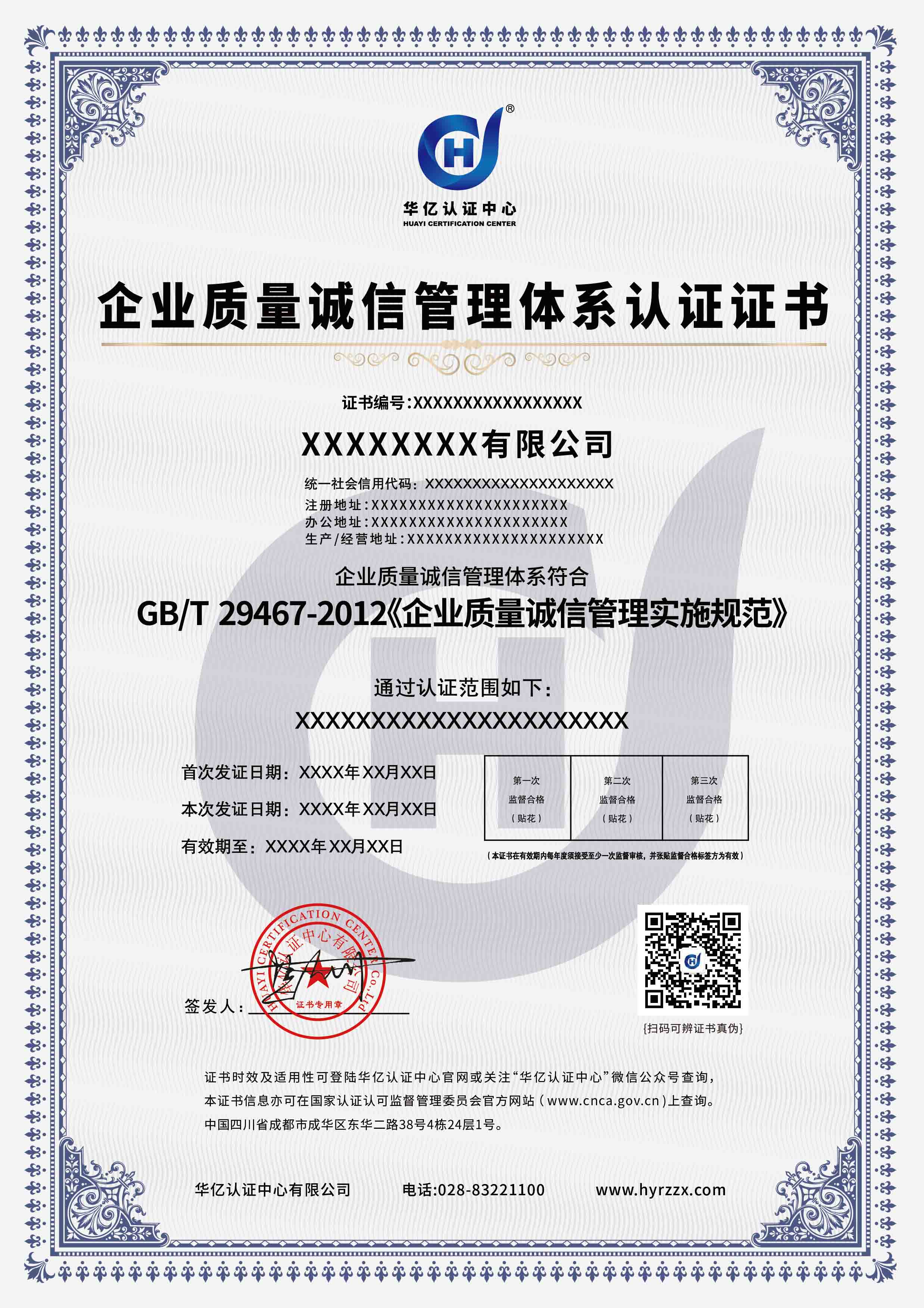 企业质量诚信管理体系认证证书样本